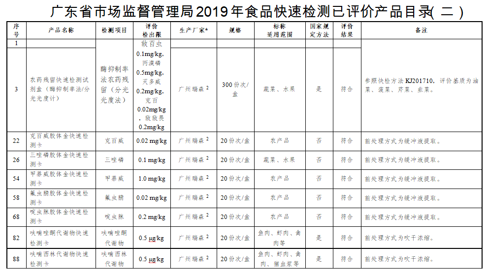 由广东省市场监督管理局组织广东省食品检验所开展的快速检测产品现场验证活动,于近日公布结果。华体会手机网页版登录入口参与的克百威快速检测卡、甲萘威快速检测卡以啶虫脒快速检测卡等11种快检产品通过现场验证。
