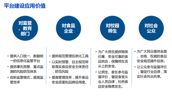 除此之外,现场智能化设备还会自动针对工作人员的非规范操作进行现场教育和行为纠正,督促工作人员逐渐养成良好的行为规范,确保因责任意识不强而导致的食安风险存在。整套系统采用物联网、云计算技术、视频分析技术、大数据分析技术等,全程监控整个食堂食品制作过程,让食物制作环节360度无死角呈现。此系统不仅有利于食堂、餐饮等企业管理人员、上级主管部门及政府市场监管部门实现高效监管,更为保障食堂食品安全提供了更为有力的技术保障!