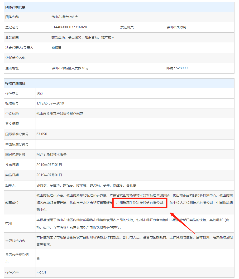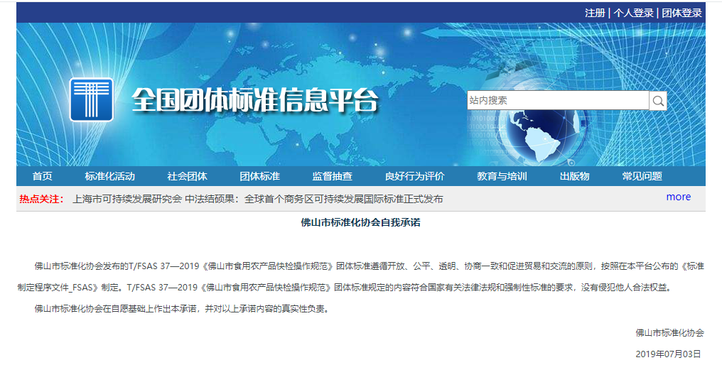 华体会手机网页版登录入口参与制定的T/FSAS 37—2019《佛山市食用农产品快检操作规范》团体标准于2019年7月1日在全国团体标准信息平台发布公示。